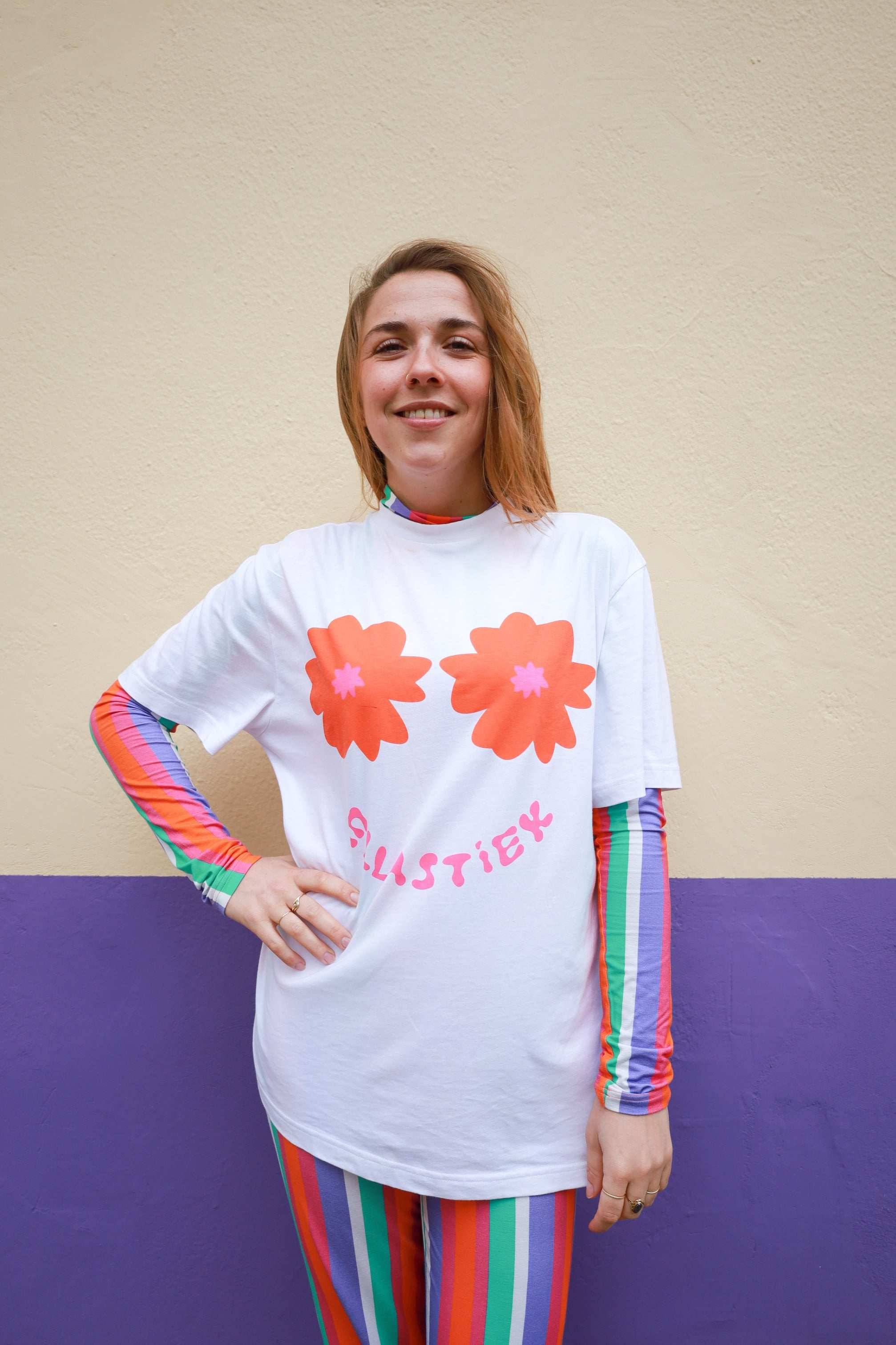 This oversized T-shirt is made from 100% organic cotton. The fabric is soft and slightly stretchy, offering a comfortable fit and effortless everyday style. Perfect for dancing at festivals, or just easy to wear everyday!