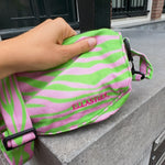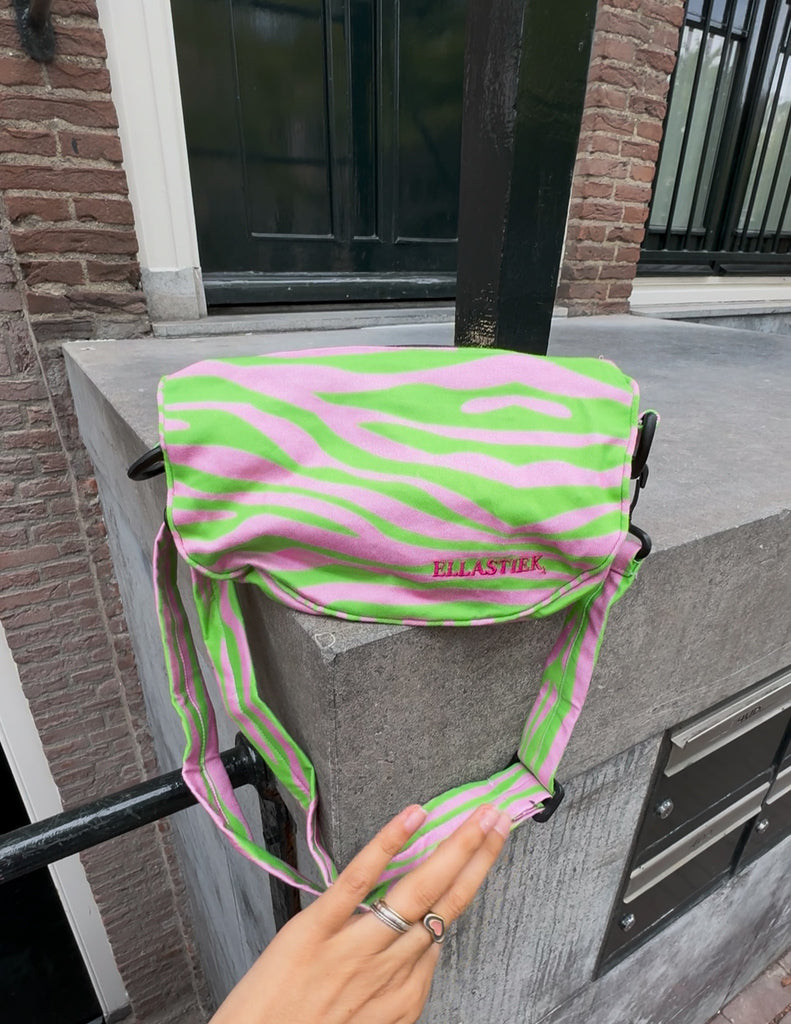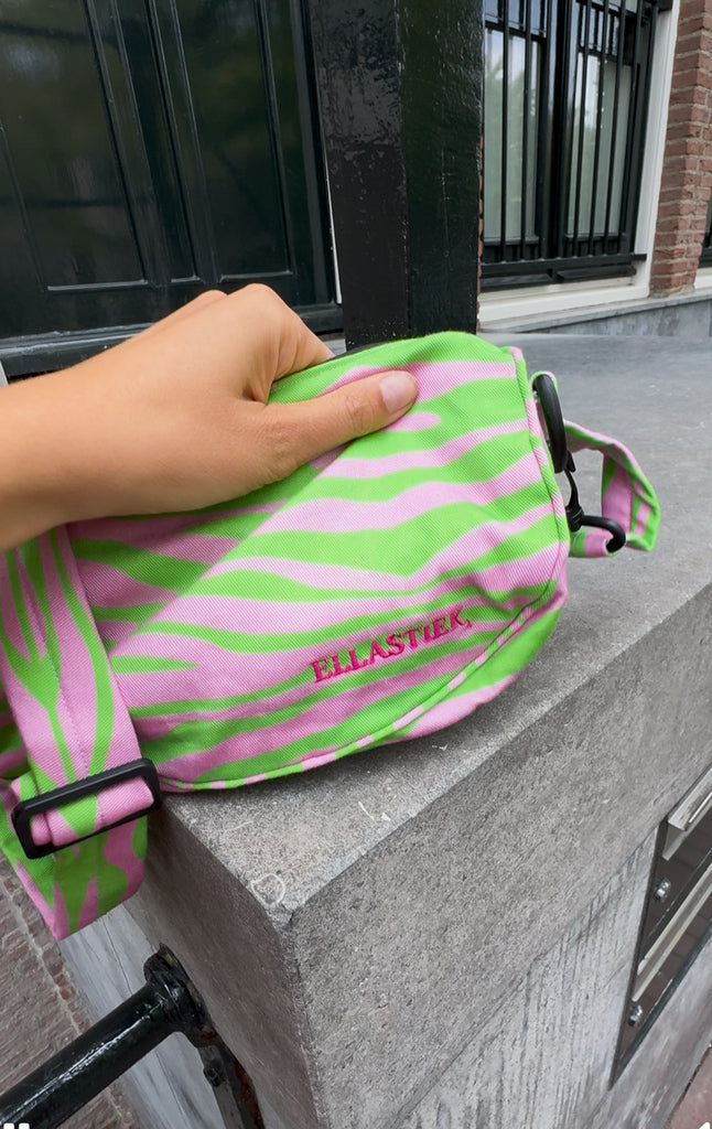 This fanny pack is made of 100% organic cotton. You can wear the bag two-sided: brighten up your outfit with the Stefanie and Kim print. The fanny pack has 2 straps: one with the Stefanie print and one with the Kim print. The bag comes with a side pocket with a zipper.