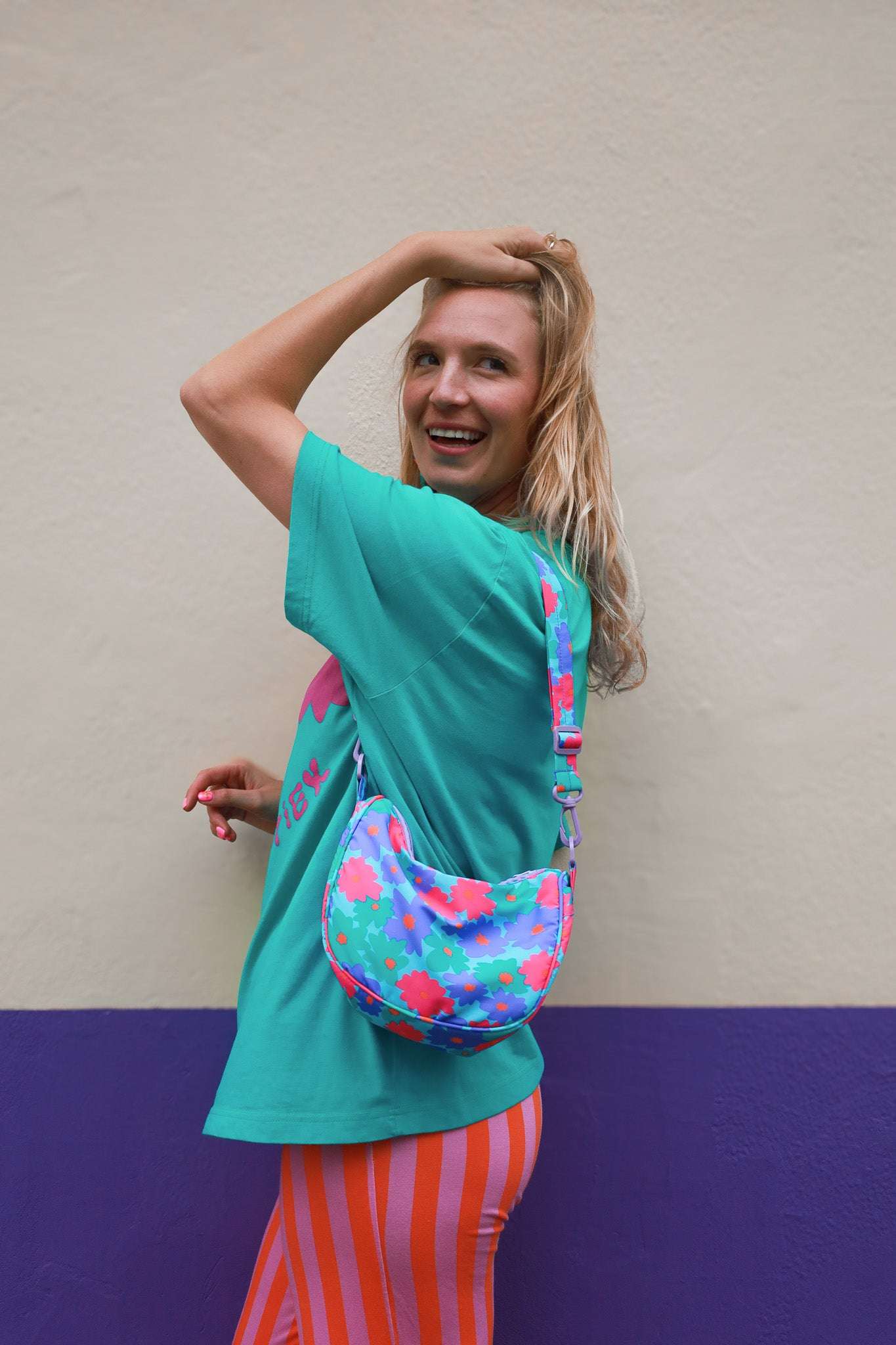 You can wear the bag two-sided: brighten up your outfit with the flower print or the pink side! The fanny pack has 2 straps: a flower one and a pink one, which match the bag. This is the must-have bag for summer because it fits everything: phone, keys, water bottle, wallet, and much more.