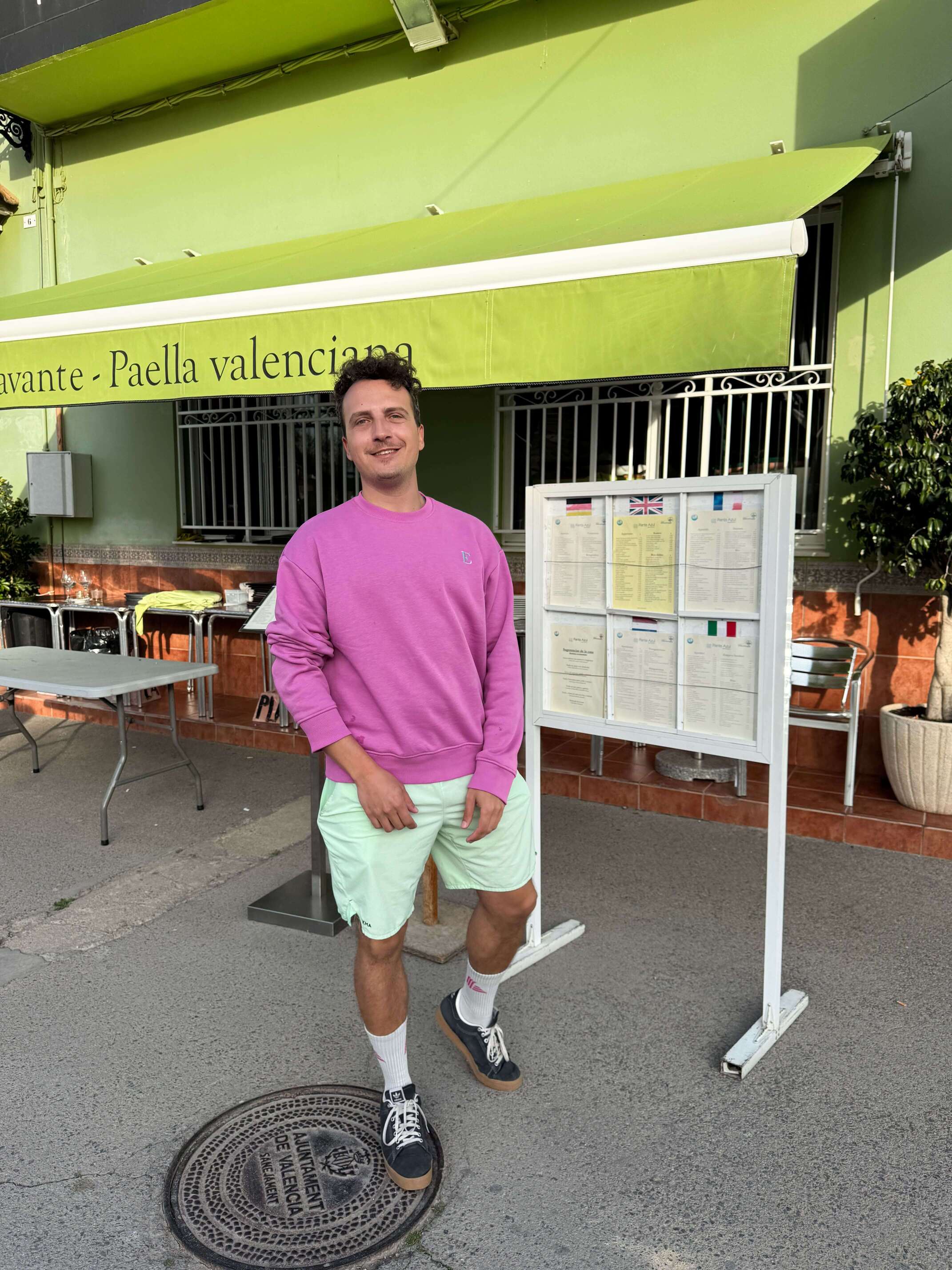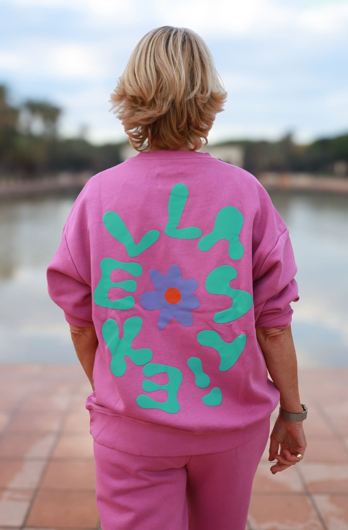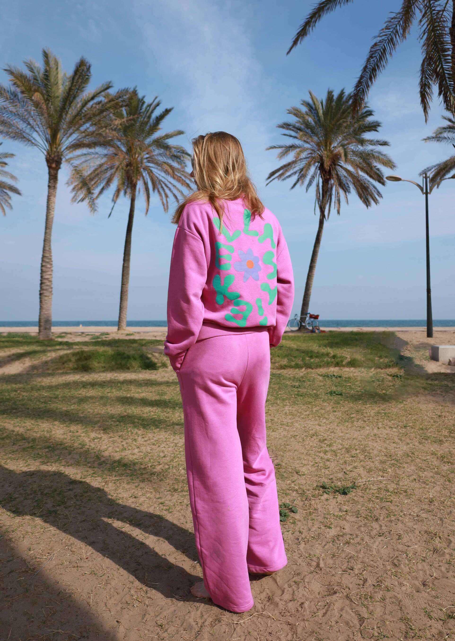 This unisex sweater is made from 80% organic cotton and 20% polyester. It has an oversized fit and the fabric feels soft. Perfect for chilly summer days and cozy festival nights!