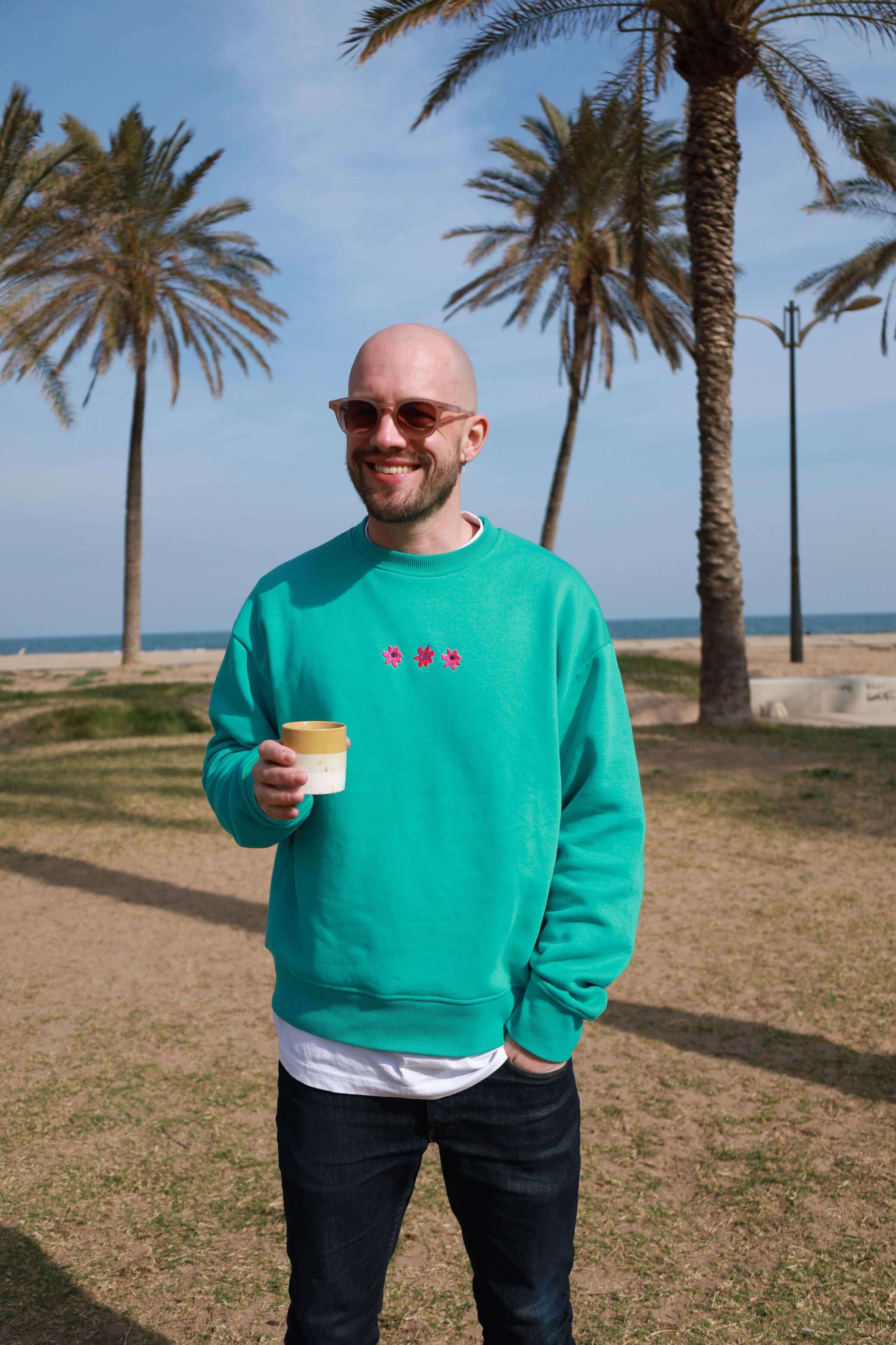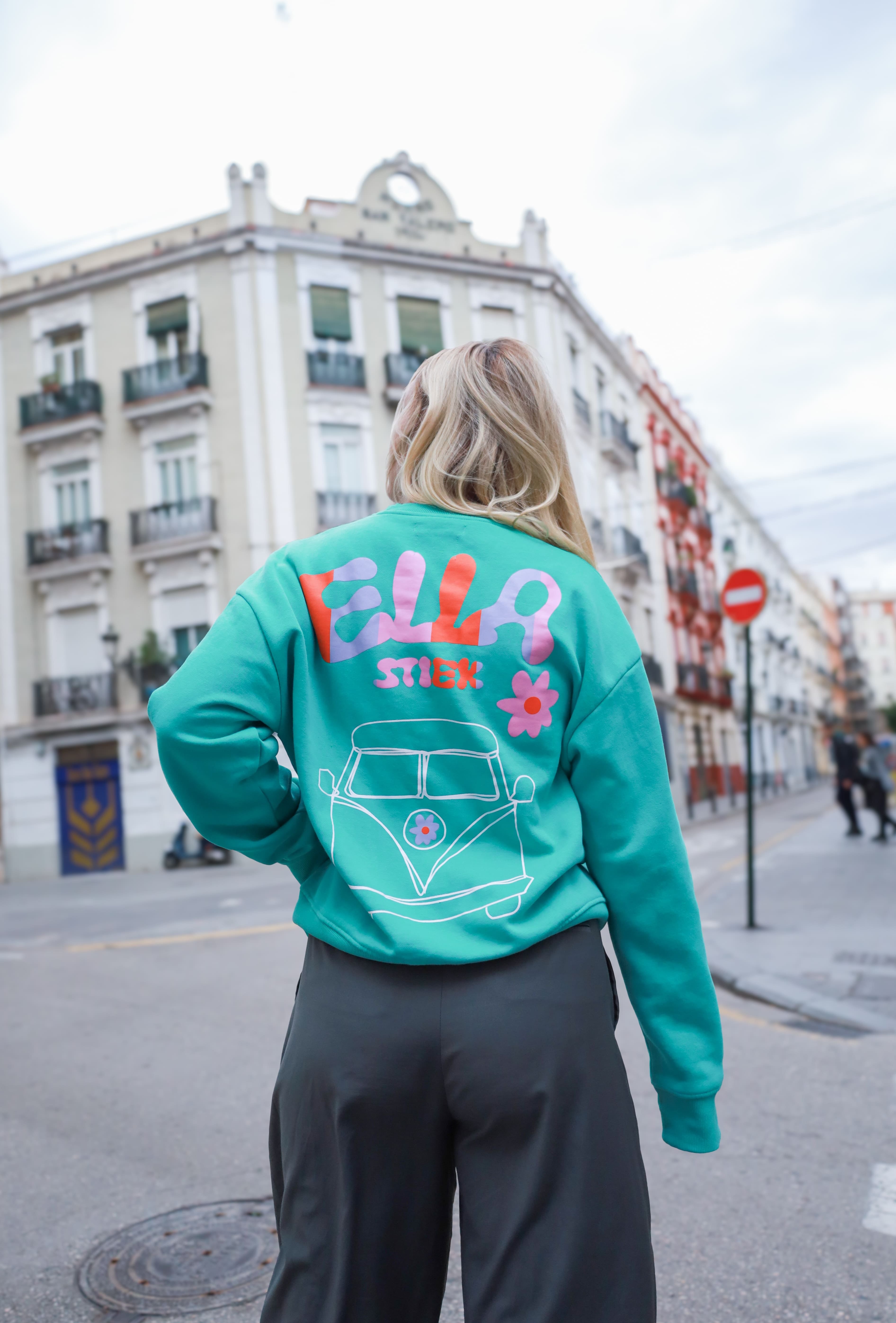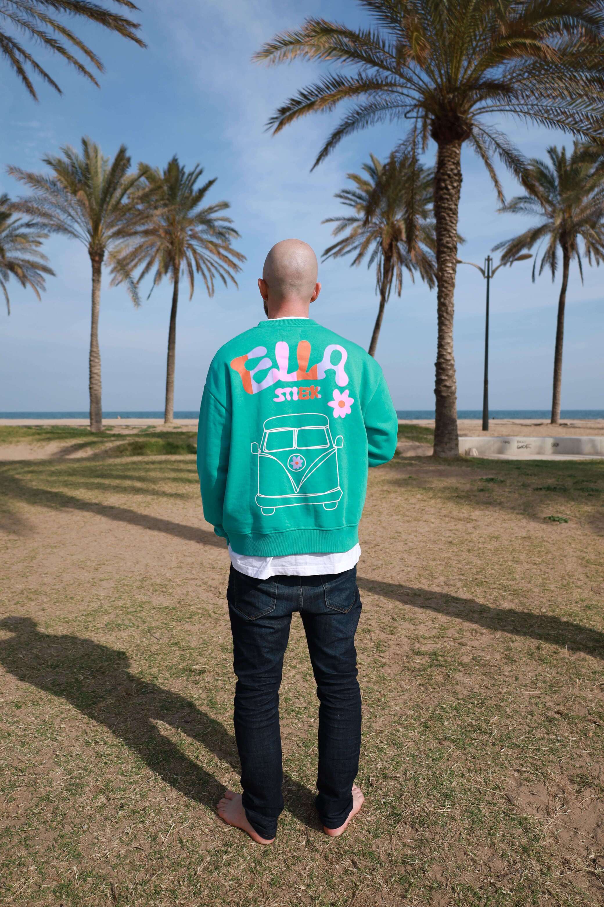This unisex sweater is made from 80% organic cotton and 20% polyester. It has an oversized fit and the fabric feels soft. Perfect for chilly summer days and cozy festival nights!
